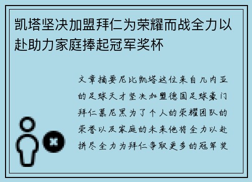 凯塔坚决加盟拜仁为荣耀而战全力以赴助力家庭捧起冠军奖杯