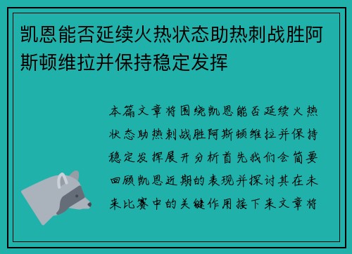 本篇文章将围绕凯恩能否延续火热状态助热刺战胜阿斯顿维拉并保持稳定发挥展开分析。首先,我们会简要回顾凯恩近期的表现,并探讨其在未来比赛中的关键作用。接下来,文章将从四个方面深入分析这一问题:凯恩的个人状态与竞技水平、热刺的整体战术安排、阿斯顿...