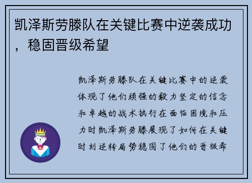 凯泽斯劳滕队在关键比赛中逆袭成功,稳固晋级希望