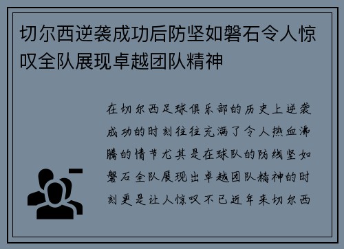 切尔西逆袭成功后防坚如磐石令人惊叹全队展现卓越团队精神