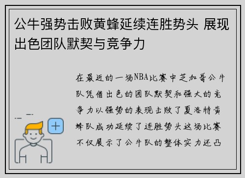 公牛强势击败黄蜂延续连胜势头 展现出色团队默契与竞争力