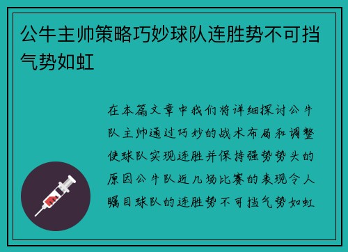 公牛主帅策略巧妙球队连胜势不可挡气势如虹