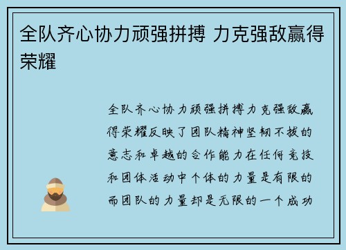全队齐心协力顽强拼搏,力克强敌赢得荣耀,反映了团队精神、坚韧不拔的意志和卓越的合作能力。在任何竞技和团体活动中,个体的力量是有限的,而团队的力量却是无限的。一个成功的团队,往往能够在面对困难和挑战时展现出强大的凝聚力和集体智慧。本文将从团队...