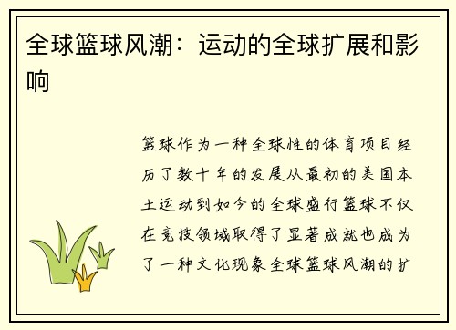篮球作为一种全球性的体育项目,经历了数十年的发展,从最初的美国本土运动到如今的全球盛行,篮球不仅在竞技领域取得了显著成就,也成为了一种文化现象。全球篮球风潮的扩展与影响,不仅体现在竞技水平的提高和各国篮球联赛的繁荣,还包括其在全球范围内的文...