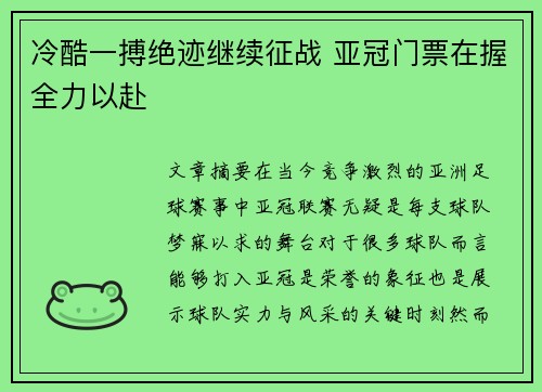 冷酷一搏绝迹继续征战 亚冠门票在握全力以赴