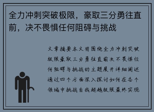 文章摘要:本文将围绕“全力冲刺突破极限,豪取三分勇往直前,决不畏惧任何阻碍与挑战”的主题展开详细阐述。通过四个方面,深入探讨如何在各个领域中挑战自我,超越极限,最终实现个人目标和团队梦想。首先,从心理素质和自信心的培养入手,分析如何克服内心...