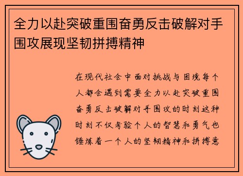 在现代社会中,面对挑战与困境,每个人都会遇到需要全力以赴突破重围、奋勇反击、破解对手围攻的时刻。这种时刻不仅考验个人的智慧和勇气,也锤炼着一个人的坚韧精神和拼搏意志。无论是在职场中遭遇竞争压力,还是在生活中面对重重困难,我们都需要保持积极的...
