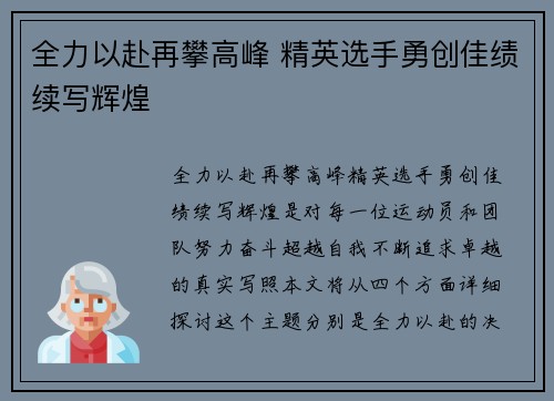 全力以赴再攀高峰,精英选手勇创佳绩续写辉煌,是对每一位运动员和团队努力奋斗、超越自我、不断追求卓越的真实写照。本文将从四个方面详细探讨这个主题,分别是:全力以赴的决心与付出、精英选手的专业训练与精神状态、勇创佳绩的技巧与方法以及如何在挑战中...