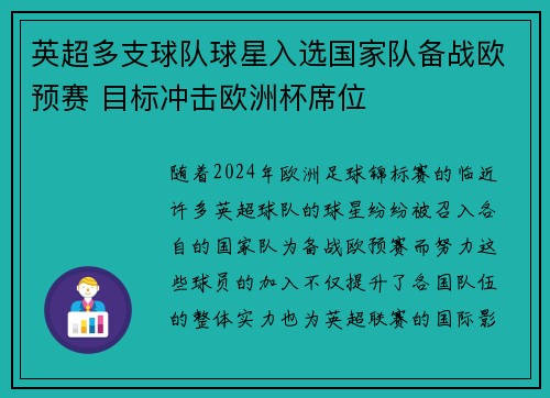 随着2024年欧洲足球锦标赛的临近,许多英超球队的球星纷纷被召入各自的国家队,为备战欧预赛而努力。这些球员的加入不仅提升了各国队伍的整体实力,也为英超联赛的国际影响力增添了浓厚的色彩。英超作为世界上最具竞争力和观赏性的足球联赛之一,培养出了...
