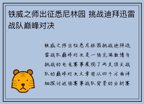 《铁威之师出征悉尼林园,挑战迪拜迅雷战队巅峰对决》是一场充满激情与挑战的电竞赛事,展现了两支顶尖战队的巅峰对决。文章将从四个方面详细探讨这场赛事:战队背景的分析、赛事前的准备与训练、赛事中的精彩对决、以及赛事对未来电竞发展的影响。通过这些方...