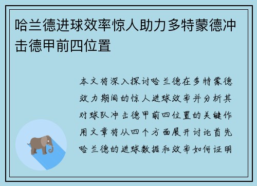本文将深入探讨哈兰德在多特蒙德效力期间的惊人进球效率,并分析其对球队冲击德甲前四位置的关键作用。文章将从四个方面展开讨论:首先,哈兰德的进球数据和效率如何证明他的进攻能力;其次,哈兰德的个人特点和比赛风格如何提升球队整体表现;接着,分析哈兰...