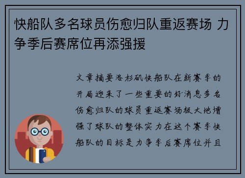 快船队多名球员伤愈归队重返赛场 力争季后赛席位再添强援