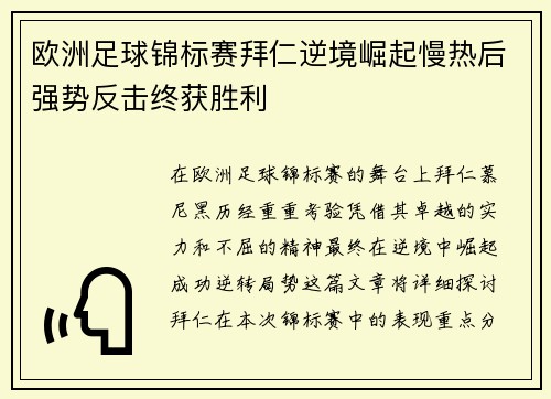 欧洲足球锦标赛拜仁逆境崛起慢热后强势反击终获胜利