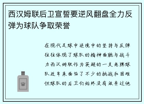 在现代足球中,逆境中的坚持与反弹,往往体现了球队的精神面貌与战斗力。西汉姆联作为英超的一支老牌球队,近年来面临了不少的挑战和困难,但球队的后卫们始终没有放弃过,他们的决心和誓言,正是为了在逆风中完成反击、为球队争取更多的荣誉。在一场困难的赛...