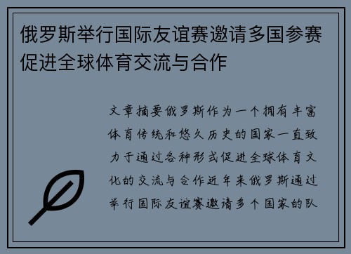 文章摘要:俄罗斯作为一个拥有丰富体育传统和悠久历史的国家,一直致力于通过各种形式促进全球体育文化的交流与合作。近年来,俄罗斯通过举行国际友谊赛,邀请多个国家的队伍参与,成功打造了一个跨国界、跨文化的体育交流平台。这种国际友谊赛不仅提升了俄罗...