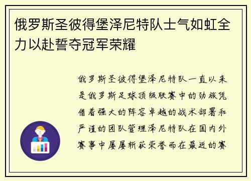 俄罗斯圣彼得堡泽尼特队士气如虹全力以赴誓夺冠军荣耀
