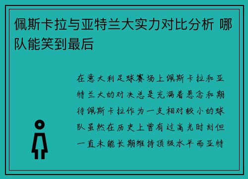 佩斯卡拉与亚特兰大实力对比分析 哪队能笑到最后