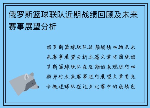 俄罗斯篮球联队近期战绩回顾及未来赛事展望分析