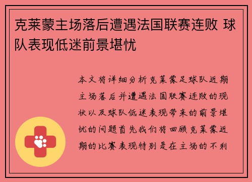克莱蒙主场落后遭遇法国联赛连败 球队表现低迷前景堪忧