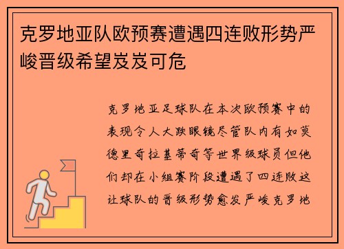 克罗地亚队欧预赛遭遇四连败形势严峻晋级希望岌岌可危