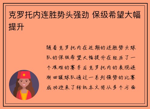 克罗托内连胜势头强劲 保级希望大幅提升