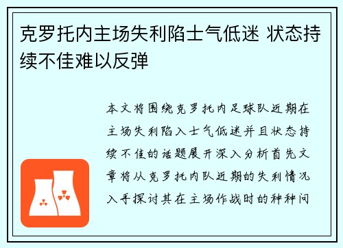 克罗托内主场失利陷士气低迷 状态持续不佳难以反弹
