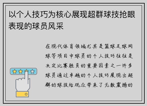 在现代体育领域,尤其是篮球、足球、网球等项目中,球员的个人技巧往往是决定比赛胜负的重要因素之一。许多球员通过卓越的个人技巧,展现出超群的球技,给观众带来了无数震撼的瞬间。本文将从四个方面探讨以个人技巧为核心的球员风采,具体分析他们如何通过独...