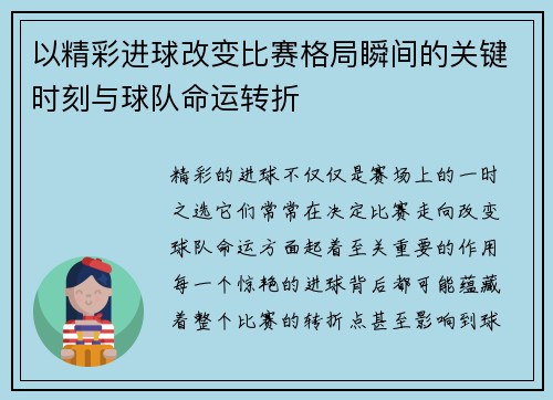 以精彩进球改变比赛格局瞬间的关键时刻与球队命运转折