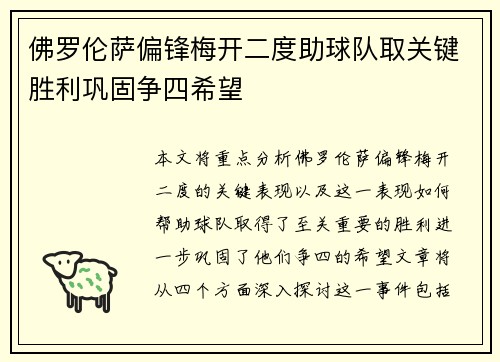 佛罗伦萨偏锋梅开二度助球队取关键胜利巩固争四希望