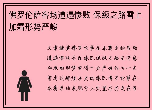 佛罗伦萨客场遭遇惨败 保级之路雪上加霜形势严峻