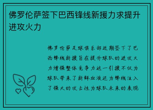 佛罗伦萨签下巴西锋线新援力求提升进攻火力