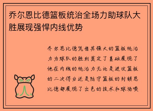 乔尔恩比德篮板统治全场力助球队大胜展现强悍内线优势