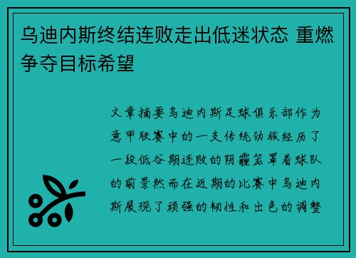 乌迪内斯终结连败走出低迷状态 重燃争夺目标希望