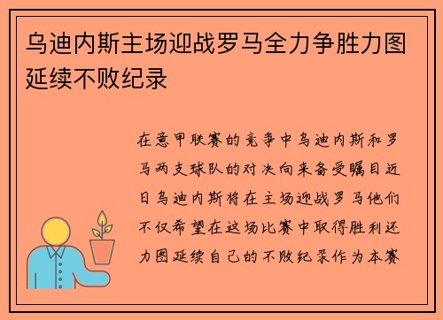 乌迪内斯主场迎战罗马全力争胜力图延续不败纪录