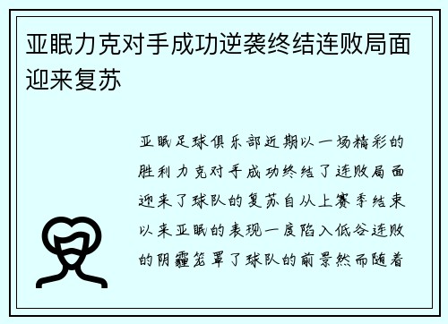 亚眠力克对手成功逆袭终结连败局面迎来复苏