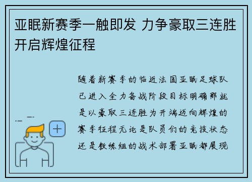 亚眠新赛季一触即发 力争豪取三连胜开启辉煌征程