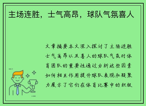 文章摘要:本文深入探讨了主场连胜、士气高昂以及喜人的球队气氛对体育团队的重要性。通过分析这些因素如何相互作用,提升球队表现和凝聚力,展示了它们在体育比赛中的积极影响。1、主场连胜的重要性主场连胜不仅仅是一场比赛的胜利,更是一种对球队士气的巨...
