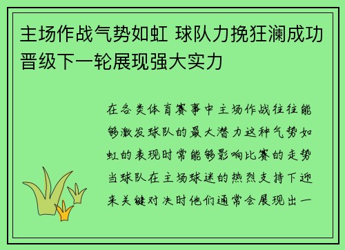 主场作战气势如虹 球队力挽狂澜成功晋级下一轮展现强大实力