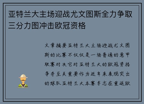 亚特兰大主场迎战尤文图斯全力争取三分力图冲击欧冠资格