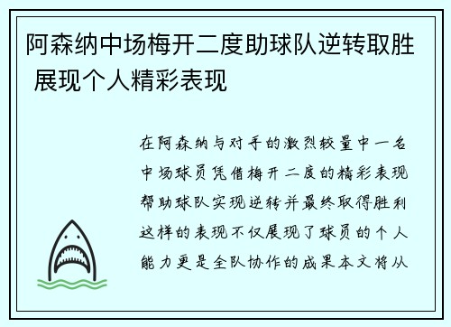 在阿森纳与对手的激烈较量中,一名中场球员凭借梅开二度的精彩表现,帮助球队实现逆转并最终取得胜利。这样的表现不仅展现了球员的个人能力,更是全队协作的成果。本文将从四个方面详细分析这名球员如何在比赛中起到决定性作用,带领阿森纳完成了这一场令人振...