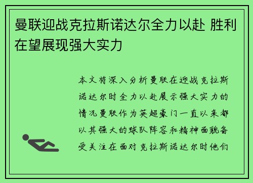 本文将深入分析曼联在迎战克拉斯诺达尔时全力以赴、展示强大实力的情况。曼联作为英超豪门,一直以来都以其强大的球队阵容和精神面貌备受关注。在面对克拉斯诺达尔时,他们不仅要展现出强大的战术能力和球员个体的出色表现,还要证明他们具备在困难比赛中稳住...
