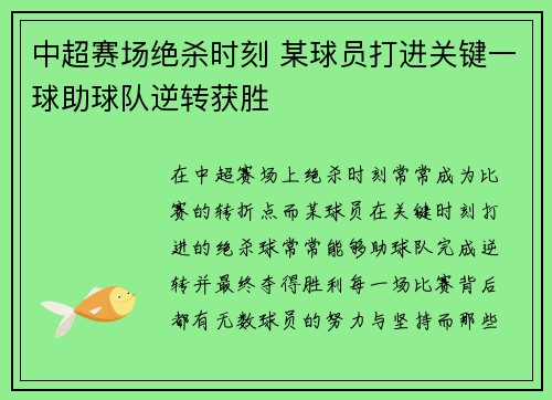 中超赛场绝杀时刻 某球员打进关键一球助球队逆转获胜