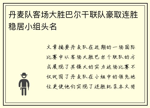 文章摘要:丹麦队在近期的一场国际比赛中,以客场大胜巴尔干联队的方式展现了其强大的实力。这场比赛不仅巩固了丹麦队在小组中的领先地位,更使他们实现了连胜纪录。本文将从四个方面进行详细分析:一是丹麦队的战术布置和比赛执行力,二是球员个人表现的亮眼...