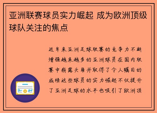 亚洲联赛球员实力崛起 成为欧洲顶级球队关注的焦点