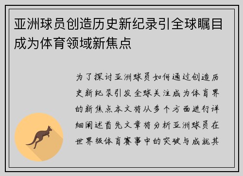 亚洲球员创造历史新纪录引全球瞩目成为体育领域新焦点