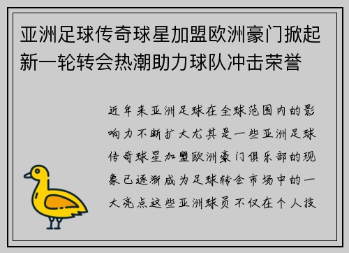 亚洲足球传奇球星加盟欧洲豪门掀起新一轮转会热潮助力球队冲击荣誉