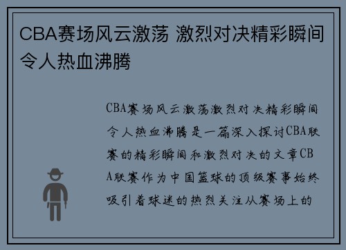 《CBA赛场风云激荡 激烈对决精彩瞬间令人热血沸腾》是一篇深入探讨CBA联赛的精彩瞬间和激烈对决的文章。CBA联赛作为中国篮球的顶级赛事,始终吸引着球迷的热烈关注。从赛场上的激烈对抗到明星球员的精彩表现,每一场比赛都充满了看点和话题。本文将...
