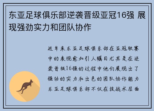 东亚足球俱乐部逆袭晋级亚冠16强 展现强劲实力和团队协作