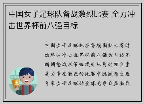 中国女子足球队在备战国际大赛时,始终以冲击世界杯前八强为目标,不断调整战术策略,提升队员的综合素质,力争在激烈的比赛中脱颖而出。近年来,女子足球的全球竞争日益激烈,中国女子足球队面临的挑战与机遇并存。在这次世界杯备战过程中,球队不仅要在技战...