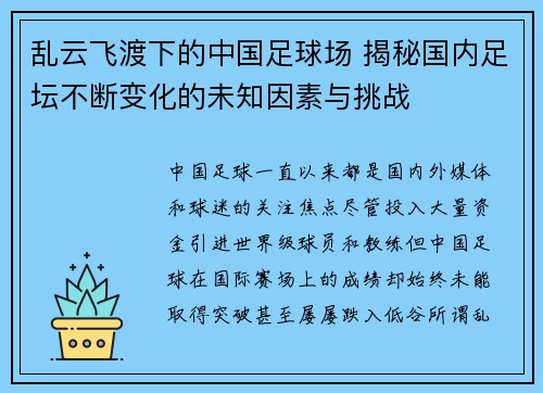 乱云飞渡下的中国足球场 揭秘国内足坛不断变化的未知因素与挑战